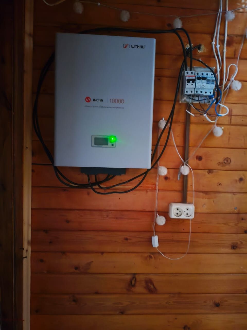 Всем привет. У нас маленький деревянный дом на даче. Летом сделали скважину и провели отопление + ещё купили морозилку и др. Нам посоветовали ещё купить стабилизатор напряжения. Изначально хотели подешевле - релейный, но электрик сказал, что будете слышать постоянные щелчки переключения (маленький домик). Пришлось поднакопить и купить Штиль IS10000. У нас сейчас на даче 7 киловатт. Здесь 9. То есть есть небольшой запас. Сейчас будем доделывать электрику в доме. Сам стабилизатор небольшой. Повесил на стену и забыл.
